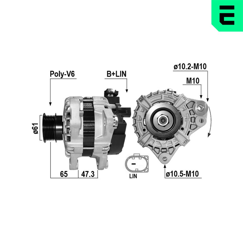 Article Information Alternator Charging Current [A] 150 Belt Pulley Ø [mm] 61 Clamp B+ M8 Number of grooves 6 Number of mounting bores 4 Vehicle Electrical System Design for vehicles with 12-volt electrical system Voltage [V] 12 | |